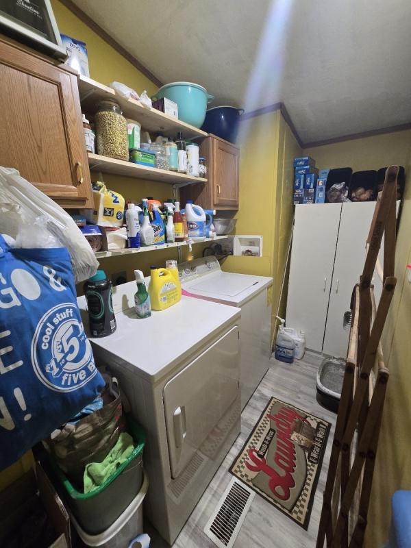 With cathedral ceilings, skylights, ceiling fans, and an open floor plan, this 2001 16x68 3 bedroom 2 bathroom Skyline Spring Cove Limited manufactured home is now available! The kitchen is large, has a refrigerator and stainless steel stove, vent hood, and new dishwasher, pantry, backsplash, window over the sink, breakfast bar, and beautiful new flooring! The primary bedroom is spacious, has a walk in closet and an attached bathroom with a walk in shower. The laundry room is separate, has overhead shelving and cabinets, and the washer and dryer are also included! There's central air, blinds, curtains, linen cabinets, and lighted ceiling fans! Outside has gutters, a shed, and a 2 car driveway! Move right in! Pets are welcome too!