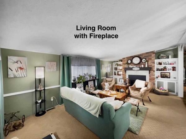 The LIVING ROOM has CARPETED FLOORING, BUILT-IN SHELVING surrounding a GAS FIREPLACE with a Tile Surround, and COUNTERTOP SEATING at the Kitchen.