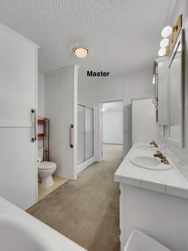 There's a SPLIT FLOORPLAN with the Master Bedroom sitting at the opposite end of the home as the remaining 2 bedrooms. The MASTER BEDROOM sits off the Living Room. There's a LINEN CLOSET and COAT CLOSET ust outside the bedroom. The MASTER BEDROOM has 2 WALK-IN CLOSETS, CARPETED FLOORING, a CEILING FAN, and its own PRIVATE BATHROOM. The bathroom features its own LINEN CLOSET, a 2-SEATED SHOWER, GARDEN TUB, DOUBLE SINKS, and VINYL FLOORING.