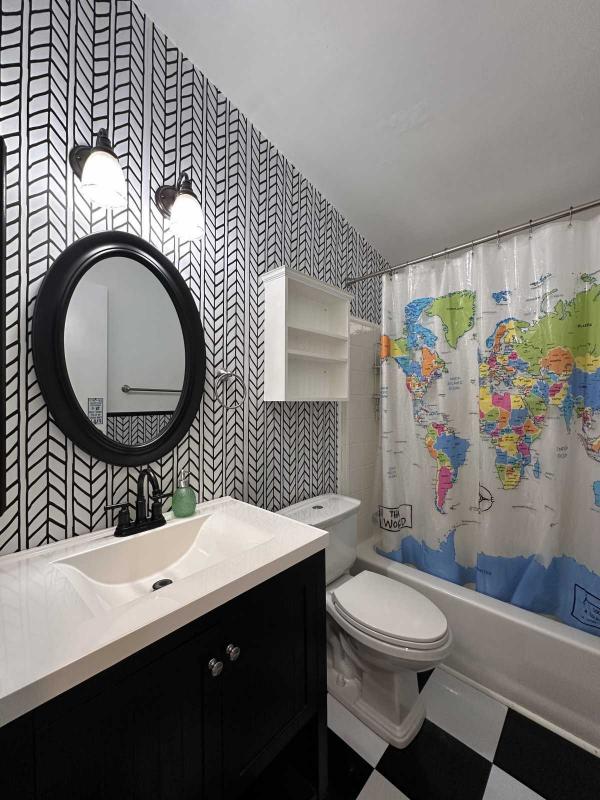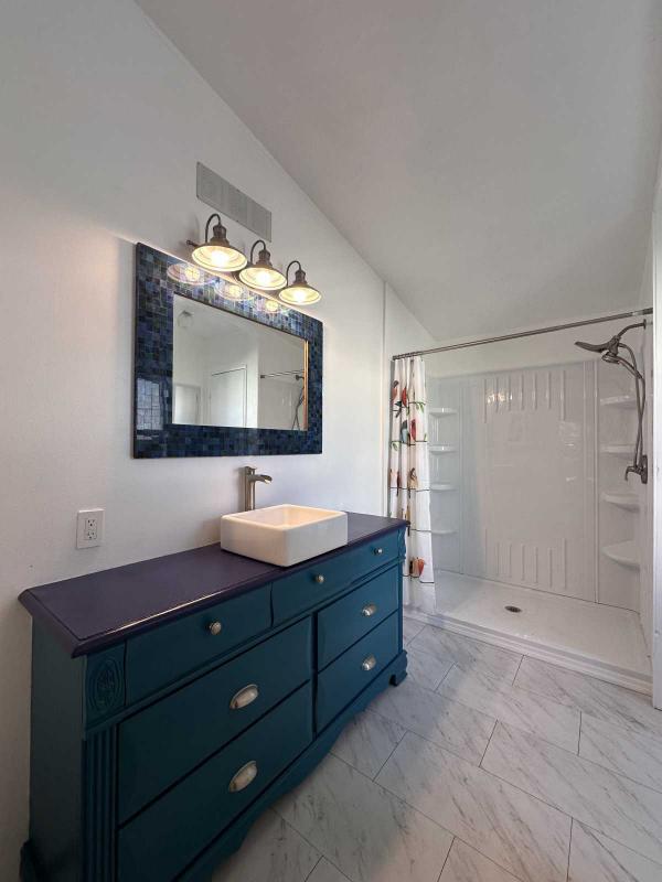 The spacious central living room is perfect for entertaining or quiet evenings at home. Both bathrooms have updated vanities, with the primary bath featuring a newer walk-in shower kit.