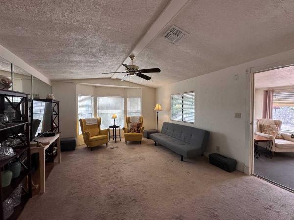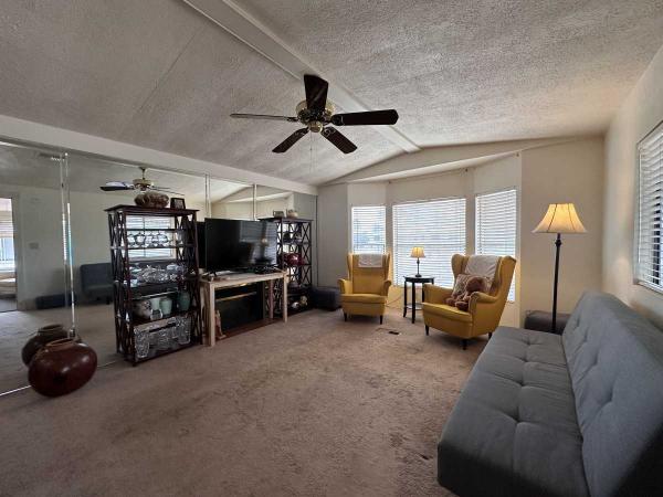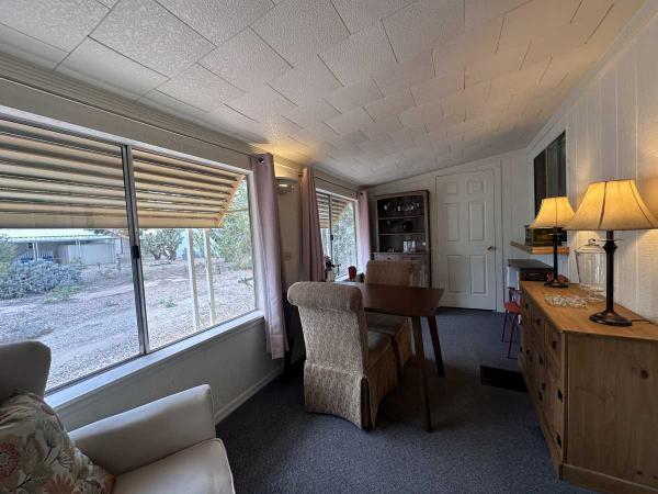 Set on a large lot to the front of community. Long driveway allowing for extra guest parking or vehicles. Bright front living room layout with cathedral ceilings. There is an addition that can be used as an office or living space as it is ducted for heat and air. Technically a one bedroom one bath yet there is a central den space that easily fits a bed and a closet could be built in to make it a second bedroom. Master can fit a king sized bed and has built in dresser drawers with extra storage. 2016 Central A/C and furnace. Upgraded Shower Kit, newer refrigerator, newer water heater, newer exterior paint. Call JUSTIN DEMPSEY today and make an offer on this excellent value in Desert Pueblo!