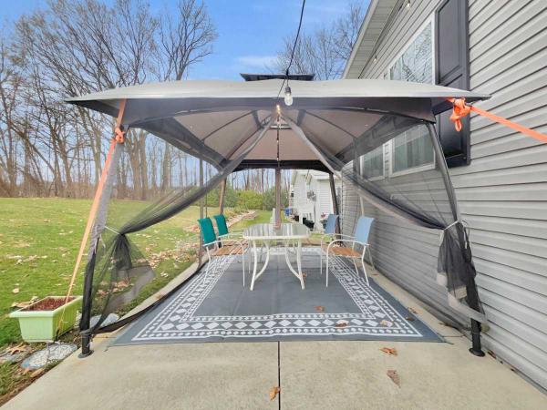 EXTERIOR FEATURES of this home include a NEW REAR CONCRETE SLAB, GAZEBO (table & chairs included), PATIO LIGHTS, THERMO ACTIVATED HEAT TAPE, SHED (w/LED power), NEWLY REINFORCED EXTERIOR STEPS, CENTRAL AIR, VINYL SIDING, a SHINGLED ROOF, GUTTERS, and SHUTTERS. This is a beautifully maintained home!